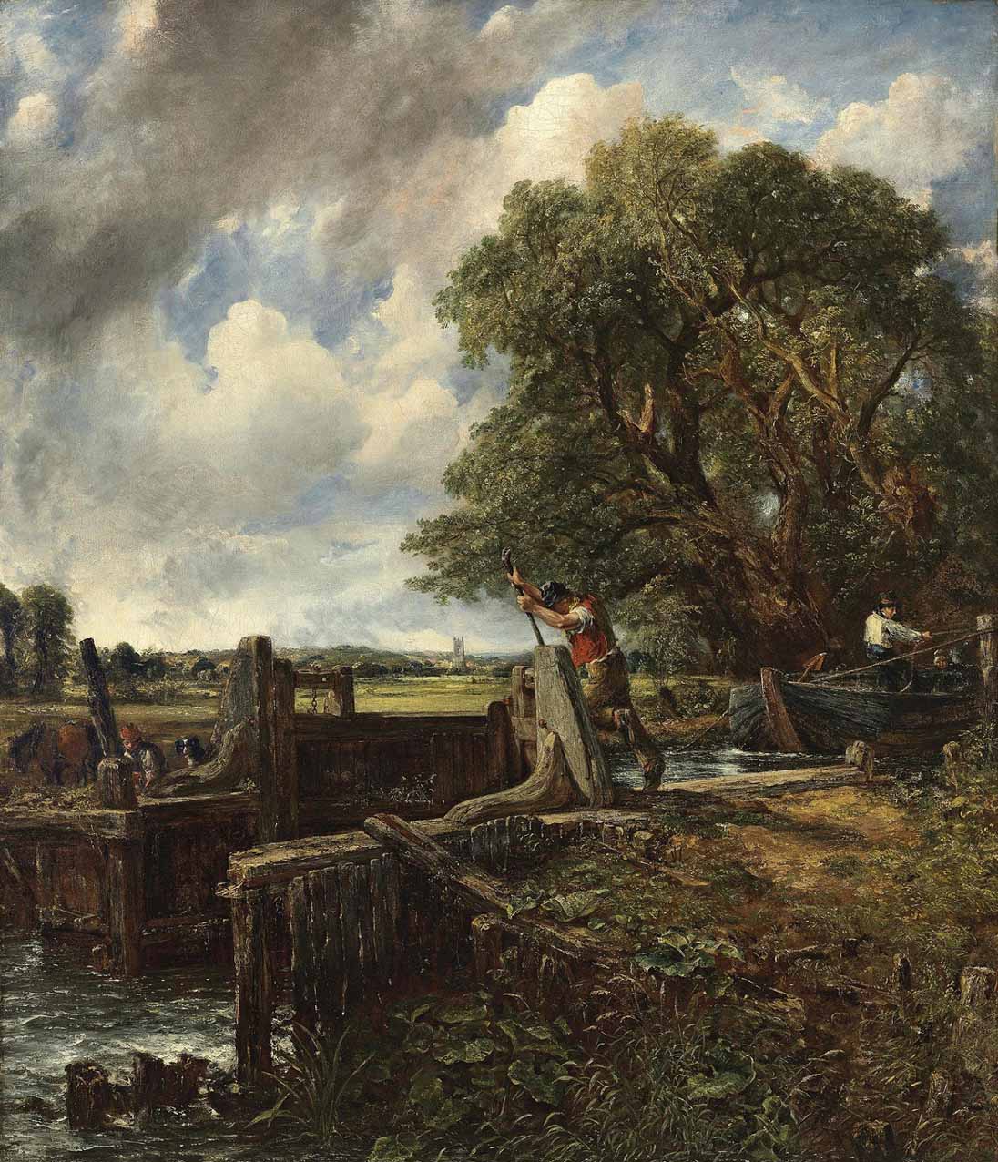 El cuadro presenta la esclusa del molino de Flatford en el río Stour, en Suffolk, un lugar muy conocido por Constable pues pertenecía a su padre; de hecho, Suffolk fue uno de sus condados favoritos, donde pintó en innumerables ocasiones. Perteneciente a una serie de seis obras, The Stour Valley Series, que el pintor presentó a la Royal Academy entre 1812 y 1825, y que se distinguen por sus grandes dimensiones (sixfooters, como los llamaba el artista, aunque no todas midiesen seis pies) y por una larga y cuidadosa elaboración, The Lock era la última de la serie en manos privadas (la más conocida quizá sea The Hay wain (El carro del heno), en la National Gallery de Londres). Comprada en 1824 en la exposición de la Royal Academy por James Morrison, el hijo de un posadero que llegó a ser el major marchante británico del siglo XIX, la obra permaneció en la misma colección hasta que los descendientes la ofrecieron en 1990 y la compró el Barón.