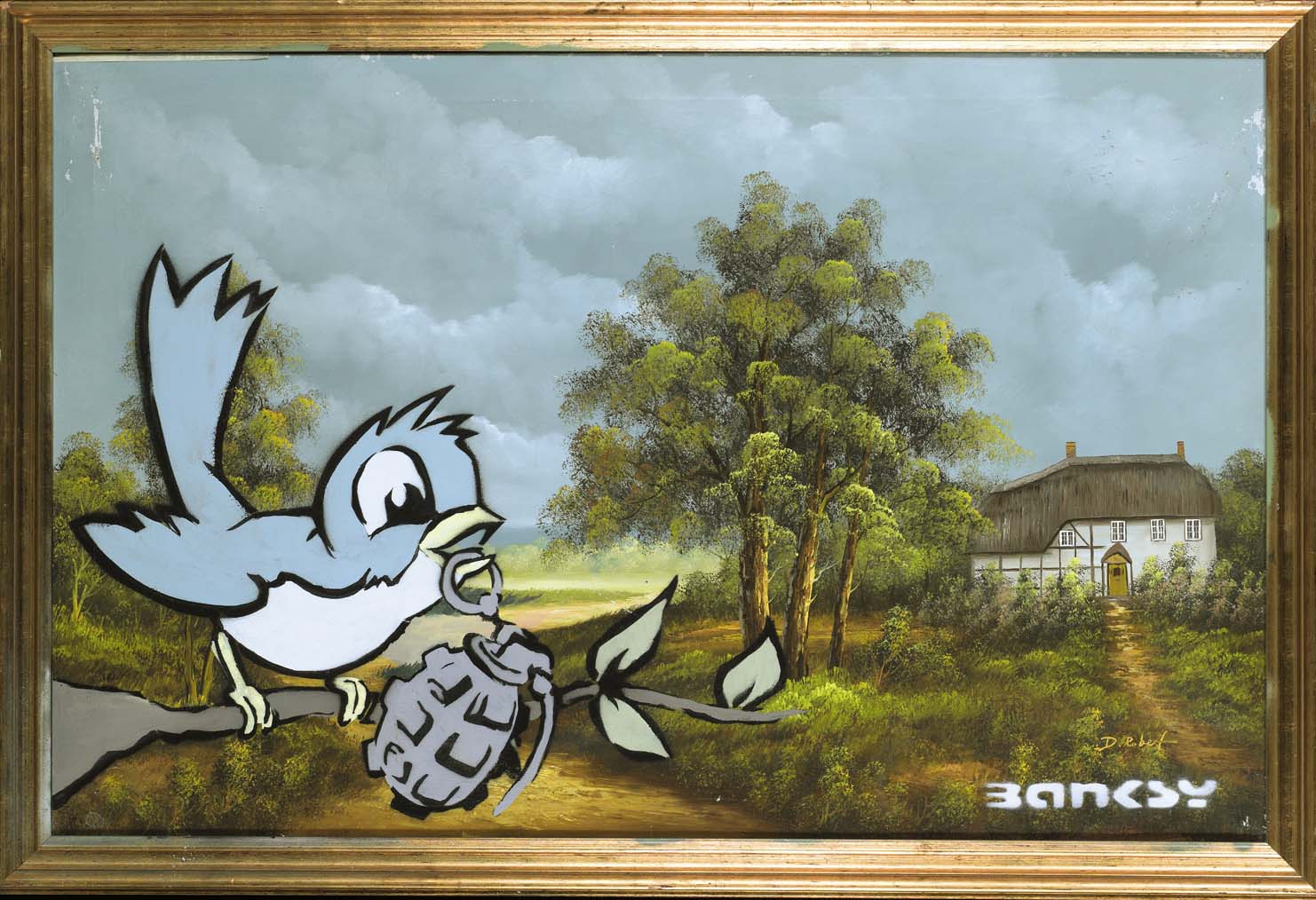 Bird and Grenade (óleo y marca de spray sobre lienzo esmaltado, 68,5 x 99 cm), realizada en 2002 y pieza única, alcanzó las 145.250 libras, lejos de la estimación de 30.000 a 50.000 libras. No es una de sus típicas escenas callejeras, pero sí tiene toda su habitual ironía, cargando nuevamente contra el orden establecido, el fondo del cuadro, con un toque entre naif, divertido y gamberro en la figura del pajarillo de dibujos animados con una granada.
